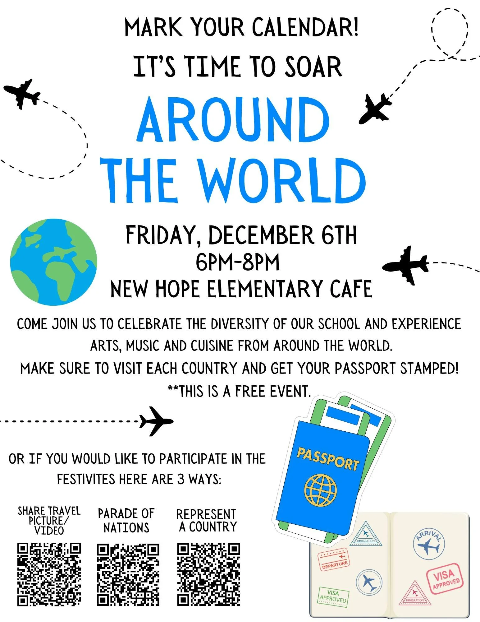 Around the World Celebration Friday, December 6, 2024 6:00 PM 8:00 PM New Hope Elementary Cafeteria 4810 Castleberry Road Cumming, GA, 30040 United States (map) Google Calendar ICS Join us on a trip Around the World as we celebrate all of the cultures and traditions represented here at New Hope. Curious about a country or culture that’s not your own? Do some research and present your work — we’ll be excited to learn from you!Sign up to host a country boothSign up to participate in the paradeSend in your travel photos for our slideshowSign up to volunteer
