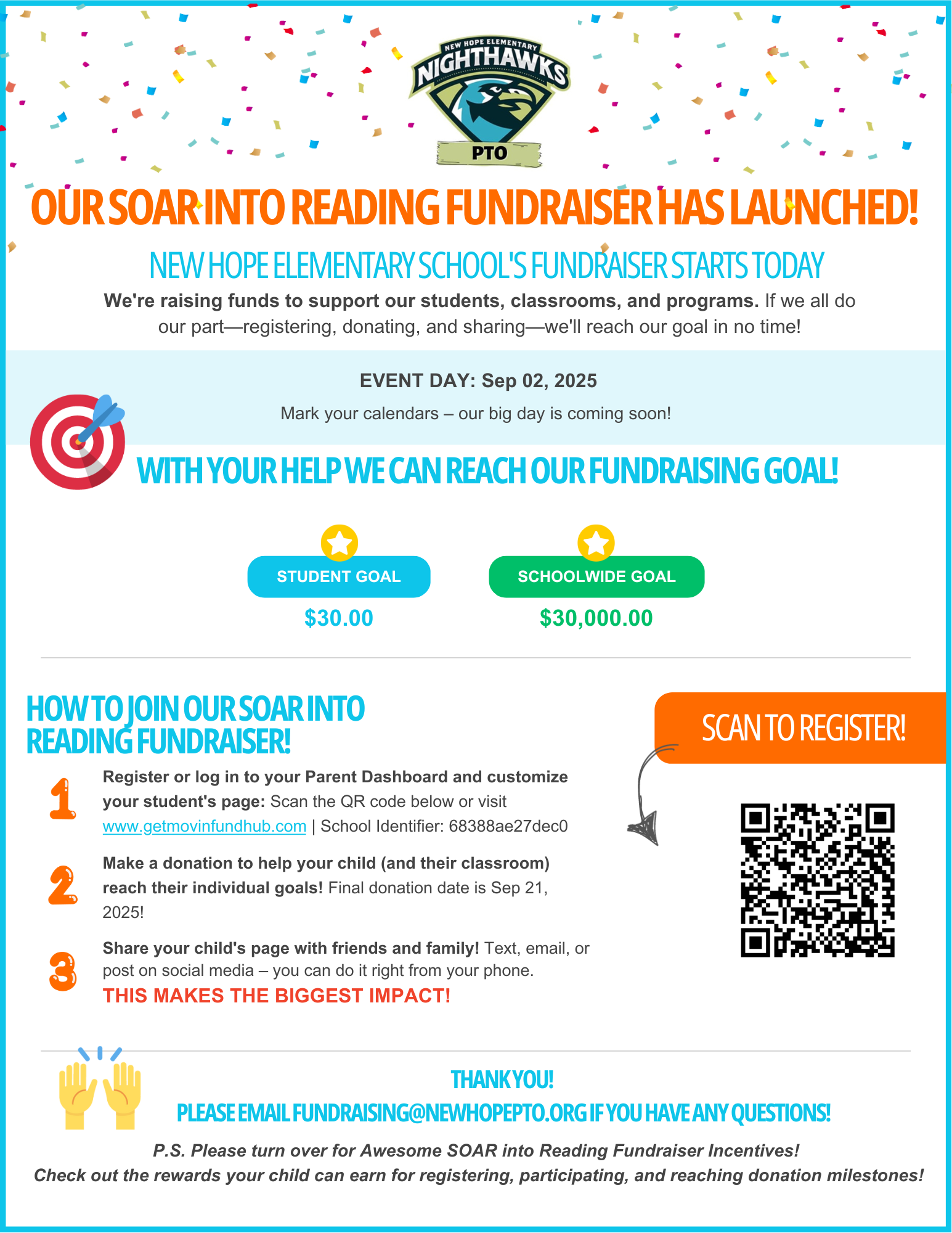 SOAR into Reading Fundraiser ENDS Friday, September 19, 2025 7:30 AM 11:59 PM New Hope Elementary PTO 4810 Castleberry Road Cumming, GA, 30040 United States (map) Google Calendar ICS